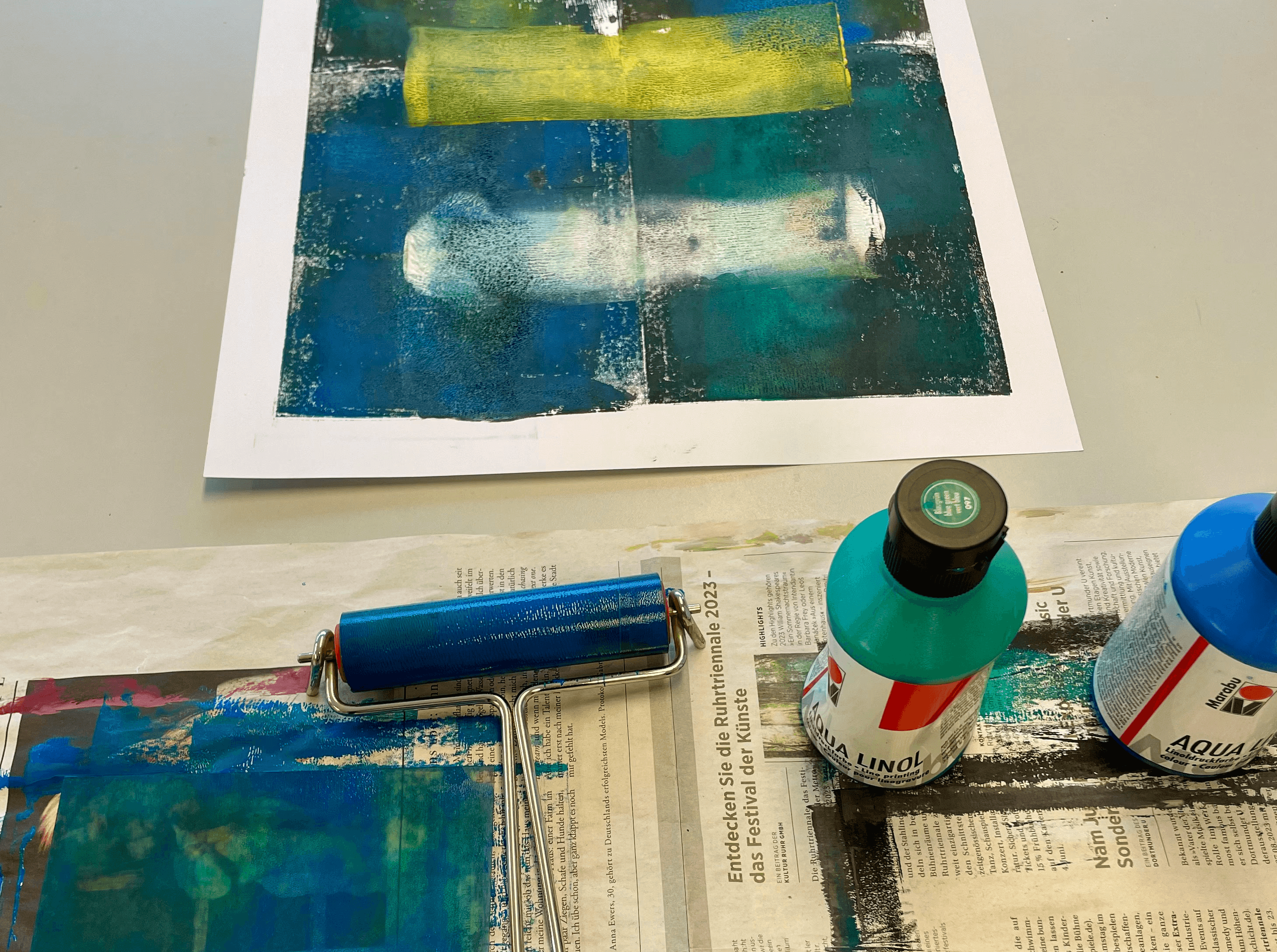Wir gestalten mit Acryl- und Druckfarben, mit Pinseln, Spachteln und experimentellen Drucktechniken.